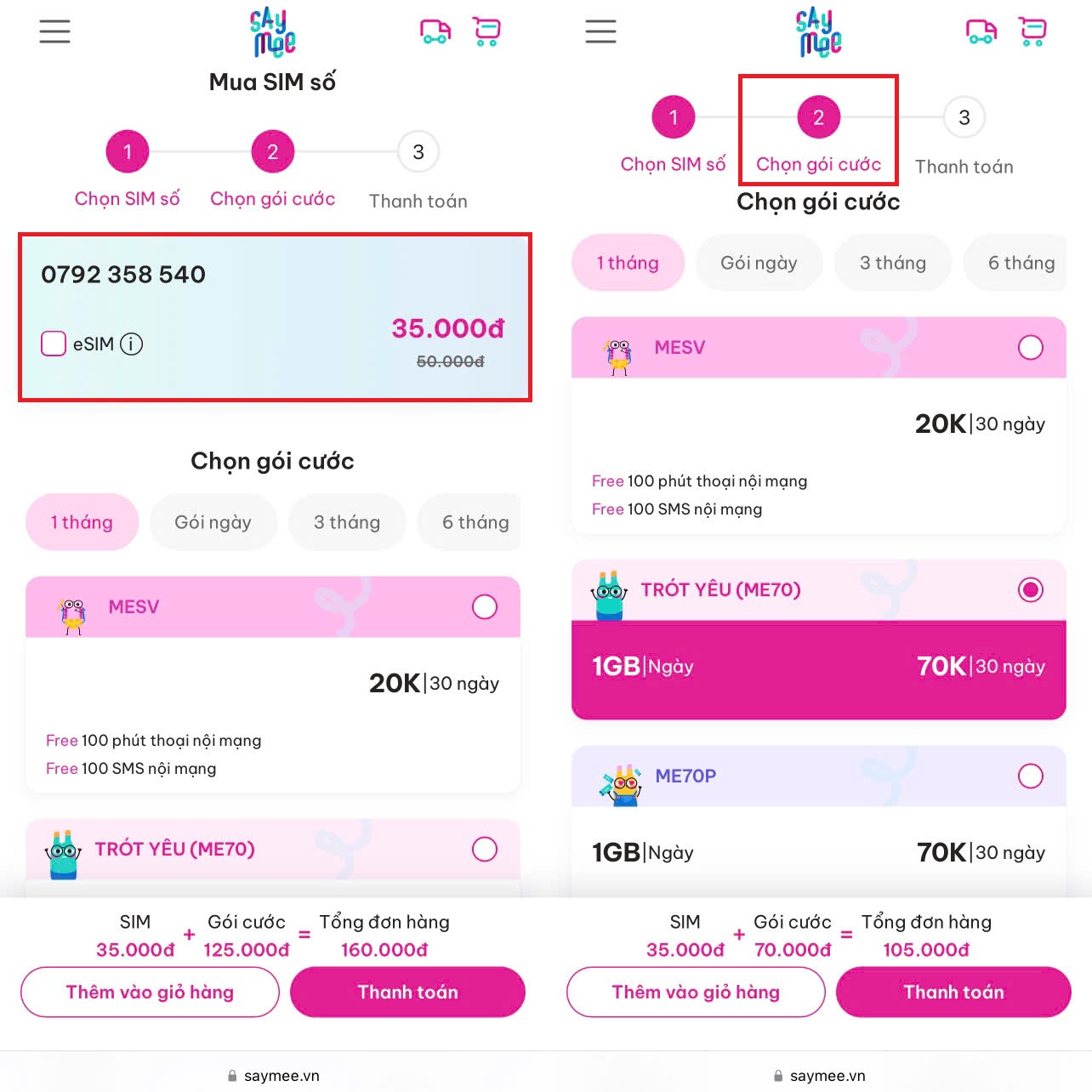 Bước 3: Kiểm tra lại số đã chọn và lựa chọn gói cước Saymee phù hợp với nhu cầu sử dụng của bạn nhất => bấm Thanh toán.