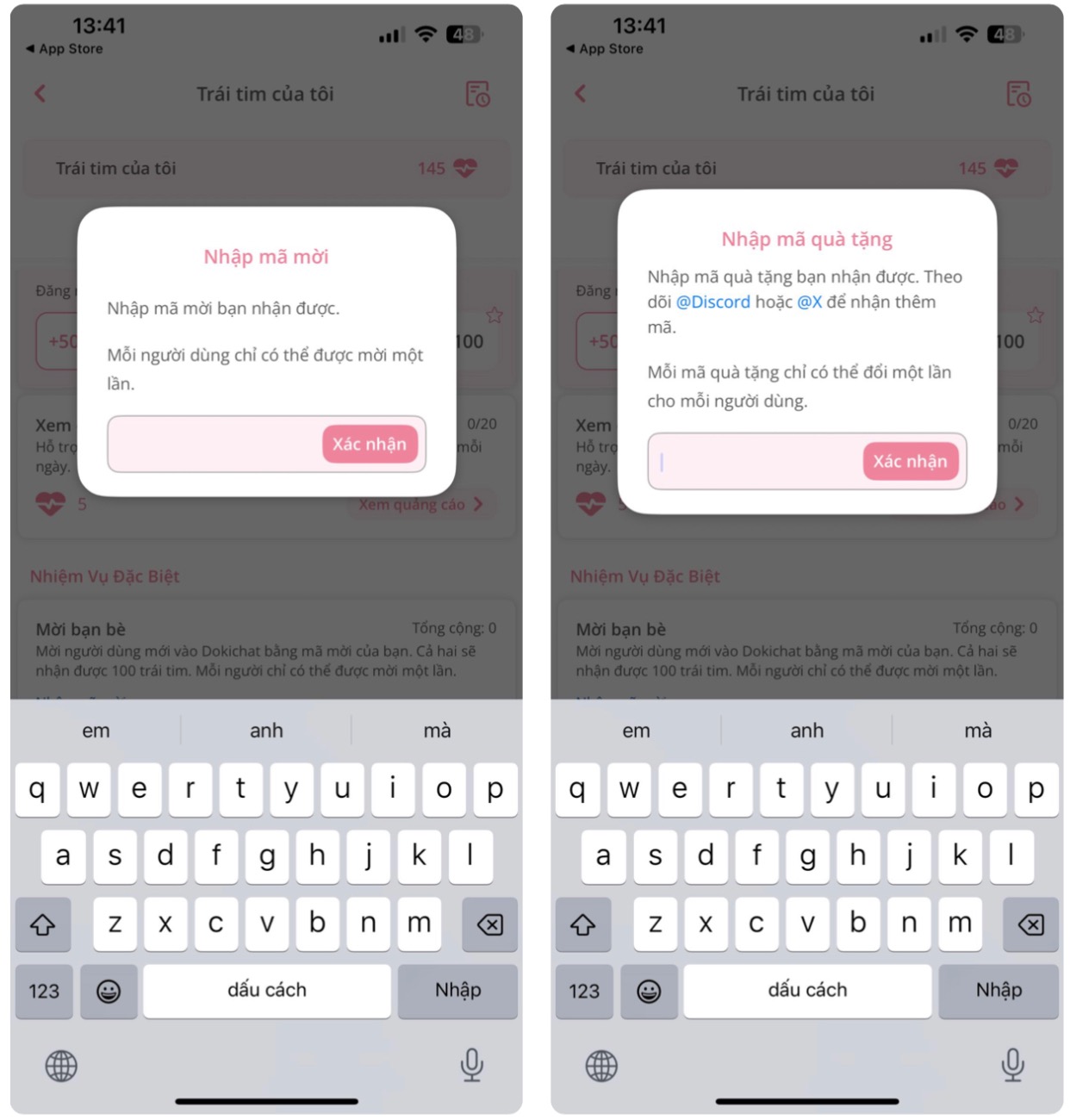 HIQQT5KC | +100 trái tim (code mời) | Hoạt động |